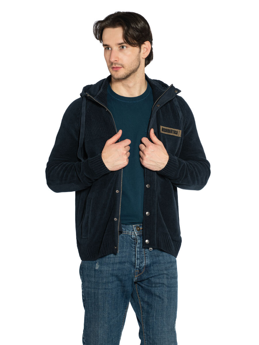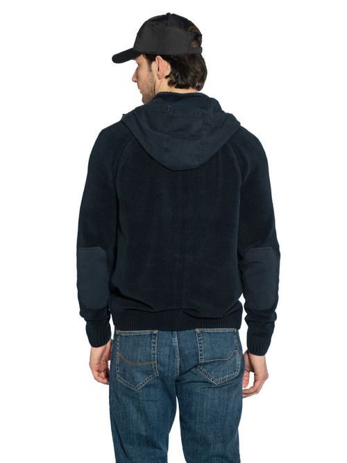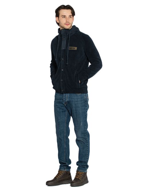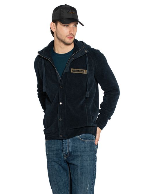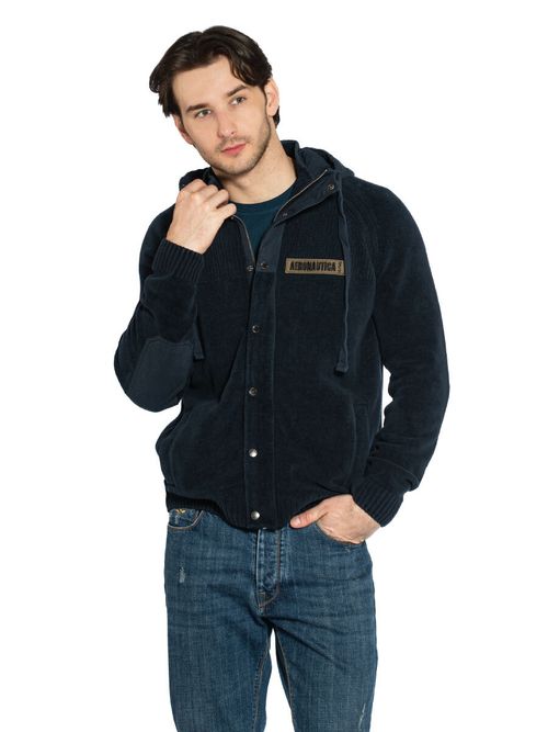 Джемпер мужской Aeronautica Militare MA1575. Эффектная кофта в стиле бомбер с капюшоном. Модель отшита из мягкого приятного на ощупь хлопкового велюра с энзимной обработкой. Разнообразная фактурная вязка придает изделию неповторимую структуру. Кофта с рукавами-реглан и двумя карманами застегивается на молнию, закрытую планкой с кнопками. Регулируемый капюшон и вставки на локтях выполнены из габардина. завершает дизайн нашивка с логотипом итальянского бренда. Кофта - стильная комфортная замена куртки в прохладные дни. Состав: 100% хлопок. Цвет Blu Navy: темно-синий. Страна бренда: Италия. Страна производства: Индия.