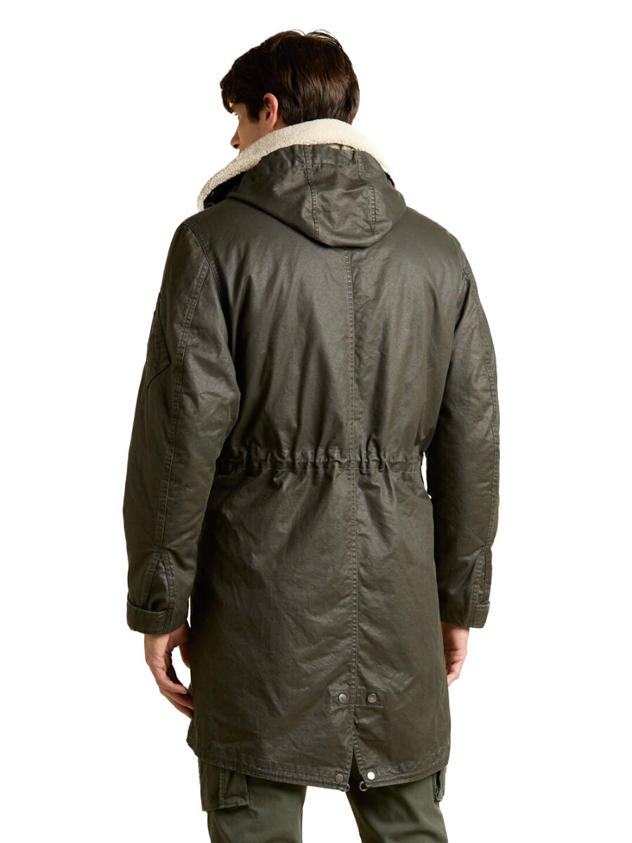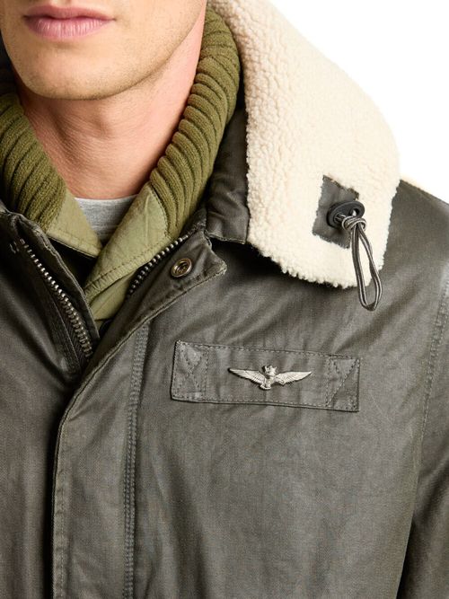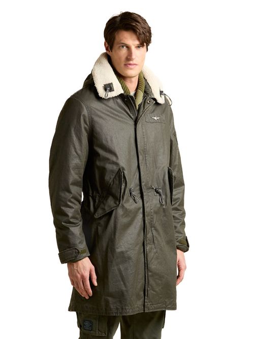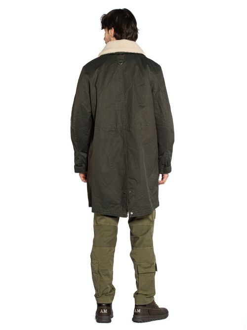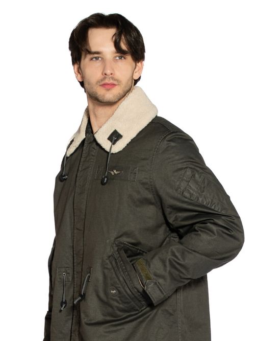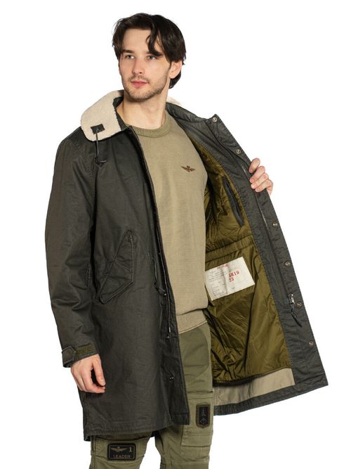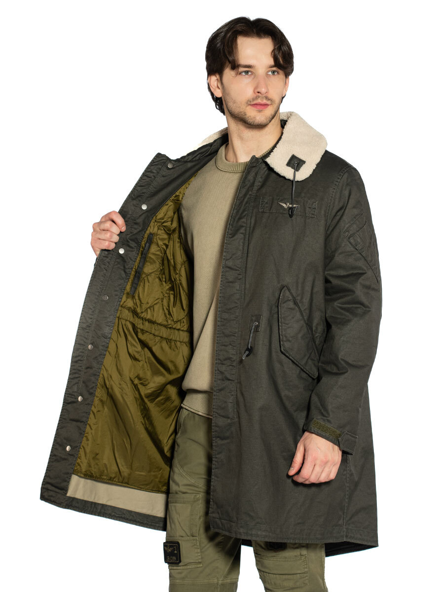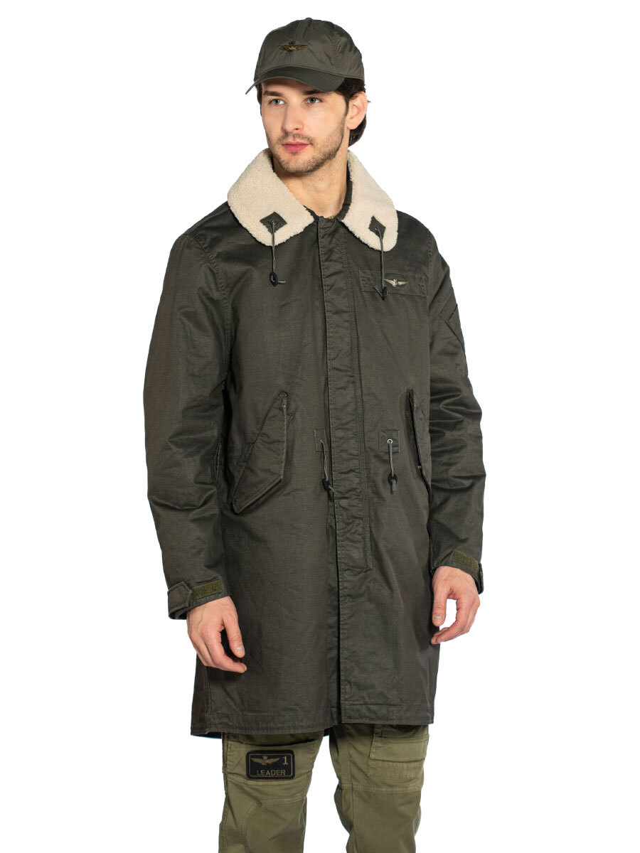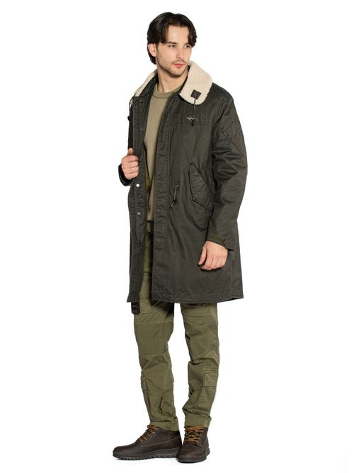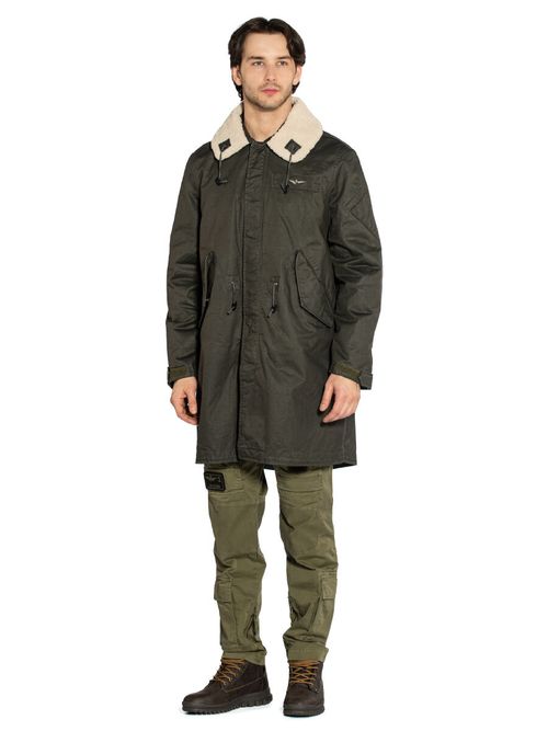 Куртка мужская Aeronautica Militare AB3020. Длинная функциональная утепленная парка со стильным винтажным дизайном. Модель выполнена из прочного хлопка со специальным водоотталкивающим покрытием. Куртка застегивается на молнию с ветрозащитной планкой и потайными кнопками. Парка дополнена регулируемым капюшоном, воротник отделан искусственным мехом. Парка имеет удлиненную спинку, шнурок на талии, два кармана с клапанами и один карман на рукаве. Внутри два кармана. Манжеты рукавов оснащены липучками. Парка декорирована металлической эмблемой орла на груди и металлическим полукольцом на спине. Состав: 100% хлопок, покрытие: 100% полиуретан. Подкладка: 100% полиамид. Утеплитель: 100% полиэстер. Цвет Peat Green: серо-зеленый. Страна бренда: Италия. Страна производства: Китай.