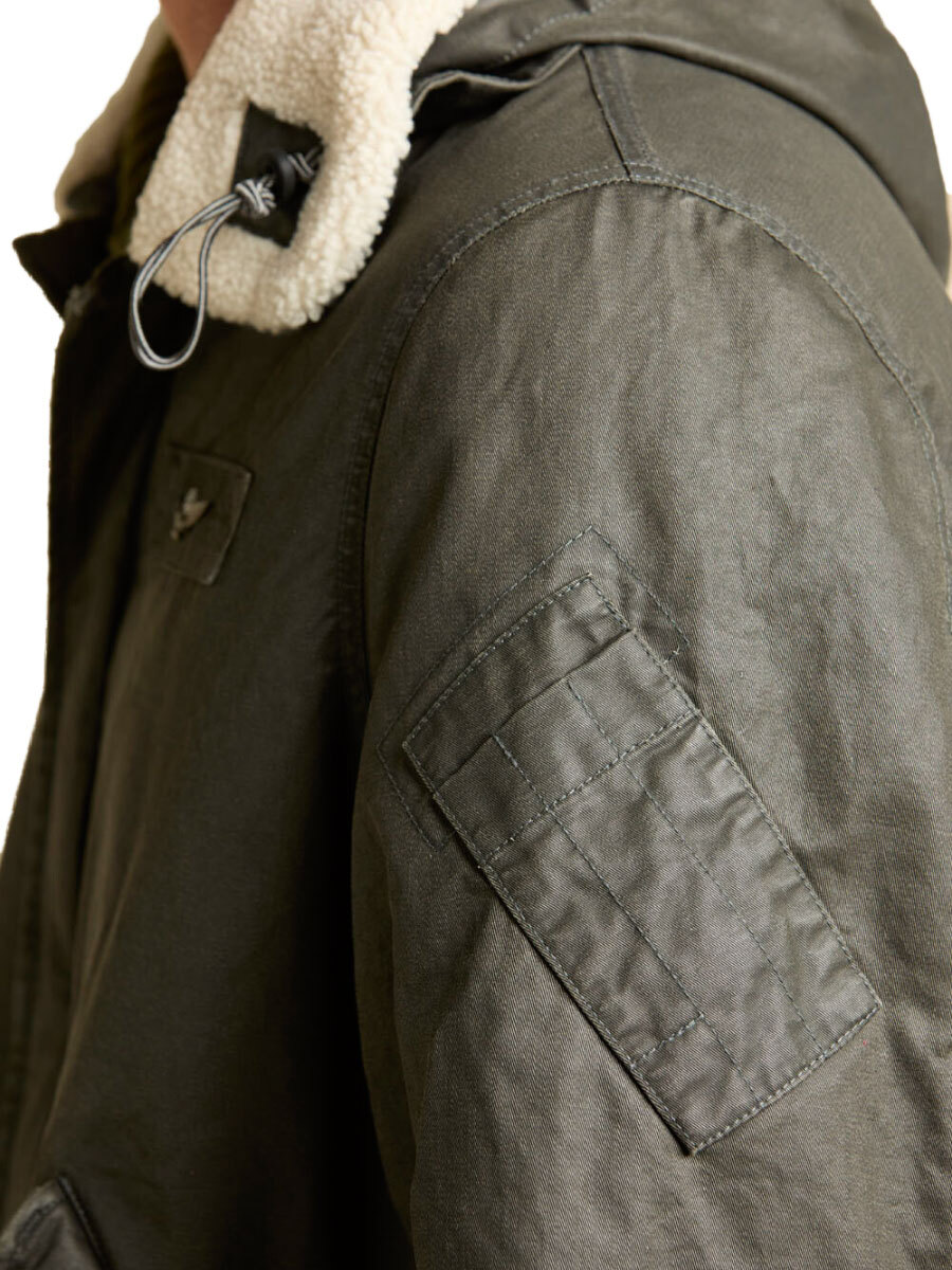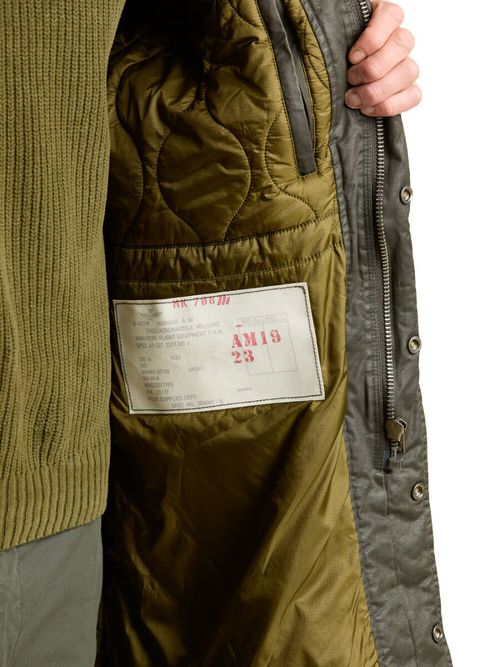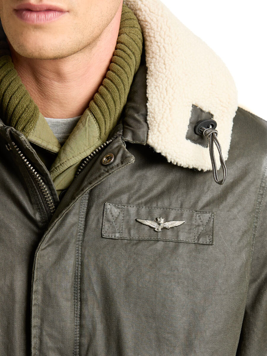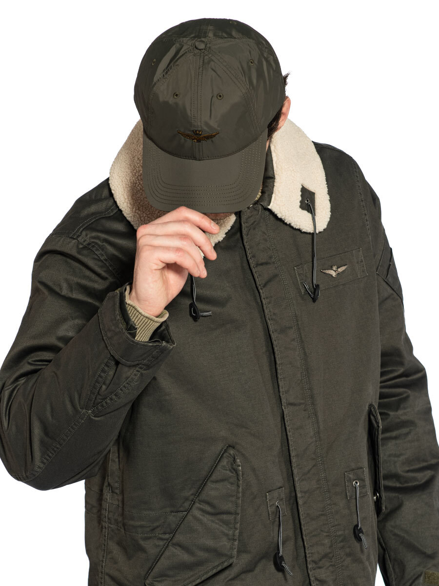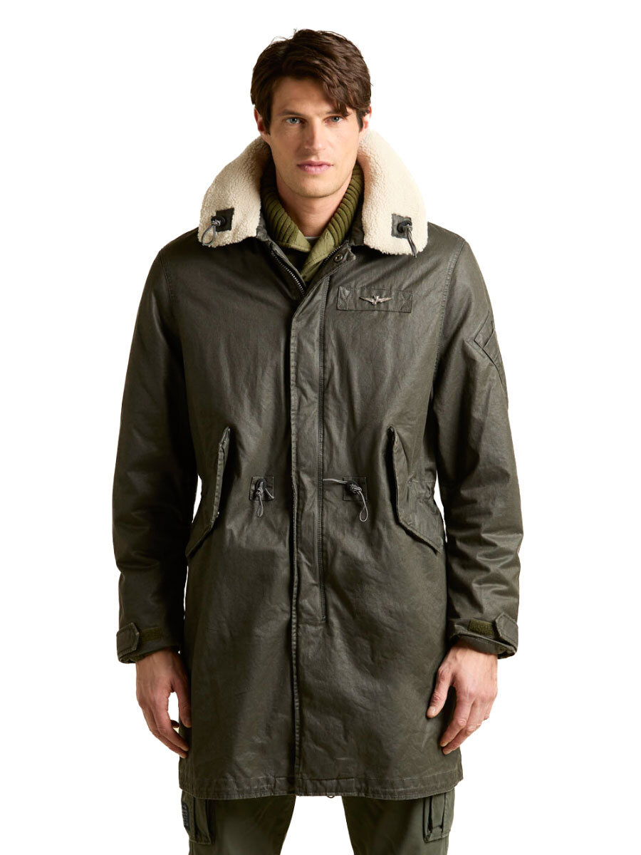 Куртка мужская Aeronautica Militare AB3020. Длинная функциональная утепленная парка со стильным винтажным дизайном. Модель выполнена из прочного хлопка со специальным водоотталкивающим покрытием. Куртка застегивается на молнию с ветрозащитной планкой и потайными кнопками. Парка дополнена регулируемым капюшоном, воротник отделан искусственным мехом. Парка имеет удлиненную спинку, шнурок на талии, два кармана с клапанами и один карман на рукаве. Внутри два кармана. Манжеты рукавов оснащены липучками. Парка декорирована металлической эмблемой орла на груди и металлическим полукольцом на спине. Состав: 100% хлопок, покрытие: 100% полиуретан. Подкладка: 100% полиамид. Утеплитель: 100% полиэстер. Цвет Peat Green: серо-зеленый. Страна бренда: Италия. Страна производства: Китай.
