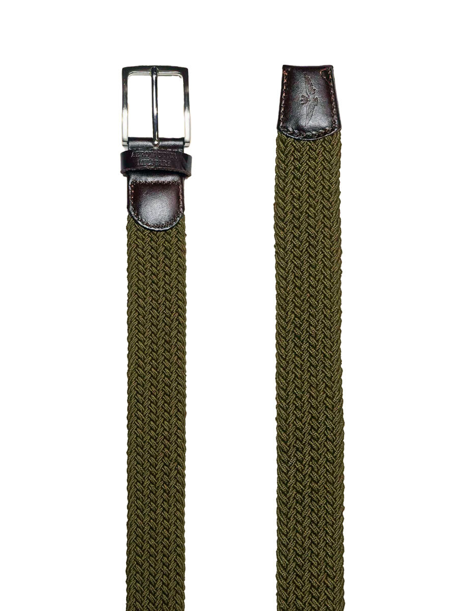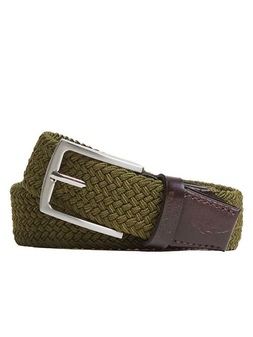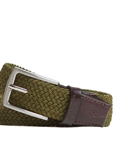 Ремень мужской Aeronautica Militare CI0307. Ремень сплетен из эластичных нейлоновых шнуров. Аксессуар выполнен с металлической пряжкой, концы изделия отделаны натуральной кожей с гравировкой символа бренда - орла. Ремень хорошо держит форму благодаря резиновой прослойке в шнуре. Ширина: 3,5 см. Состав: 65% полиэстер, 35% резина. Вставки: 100% кожа. Цвет Dark Musk: зеленый. Страна бренда: Италия. Страна производства: Китай.