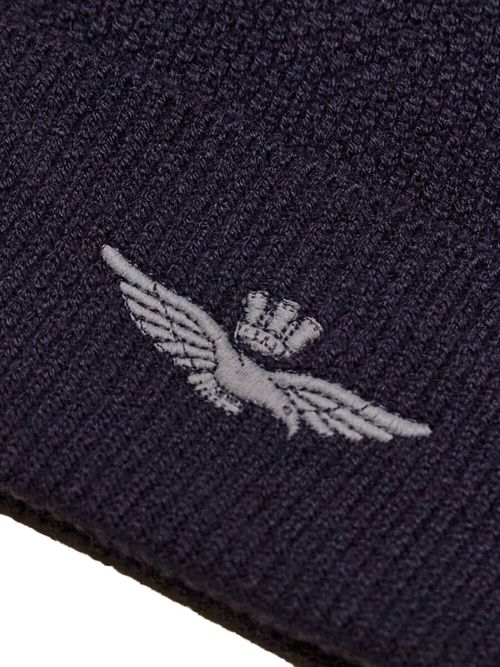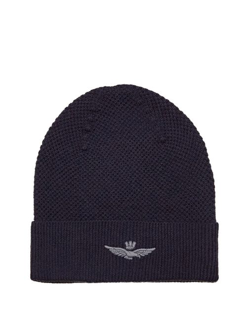 Шапка Aeronautica Militare CU0086. Полушерстяная шапка связана объемным узором в виде сот. Модель выполнена с ребристым отворотом, на котором вышит символ бренда - орел. Состав: 50% хлопок, 50% шерсть. Цвет Blu Navy: темно-синий. Страна бренда: Италия. Страна производства: Китай.