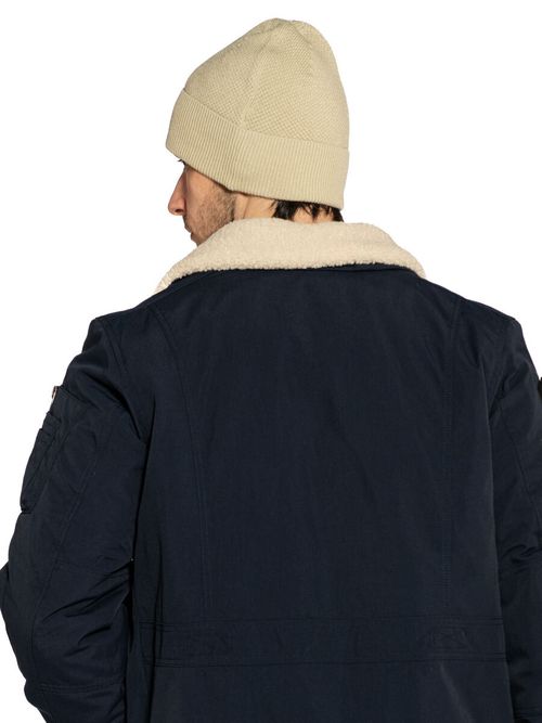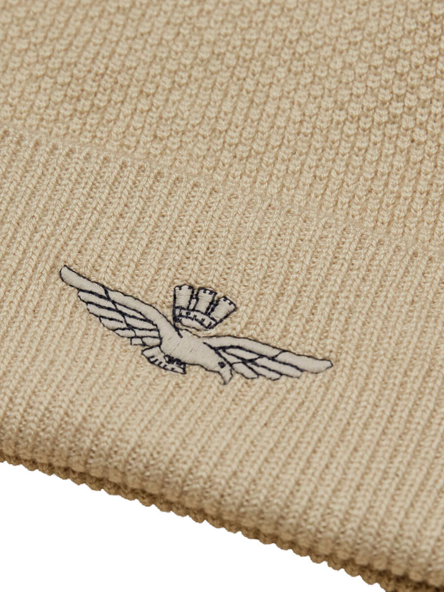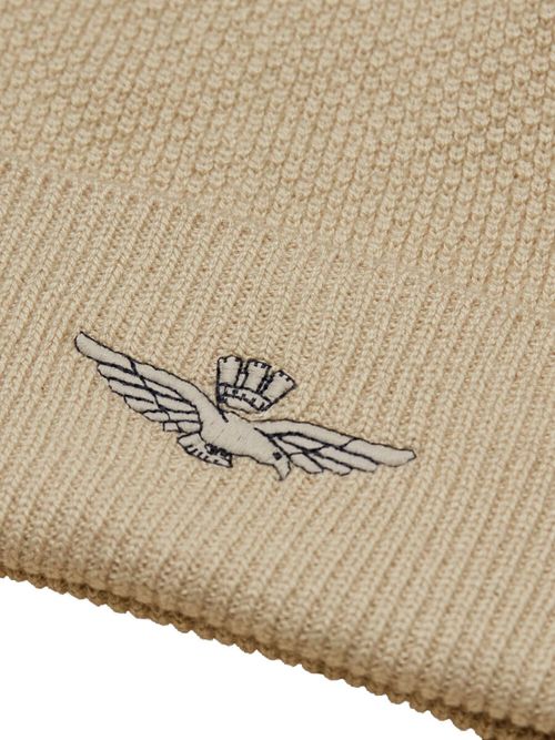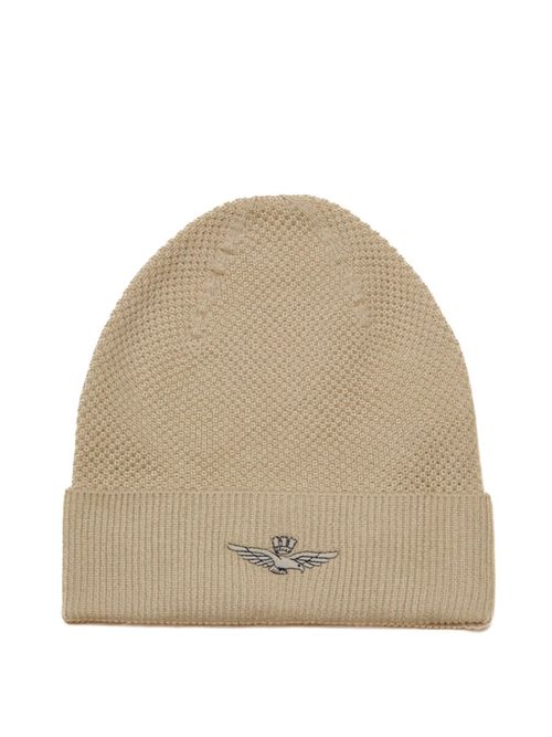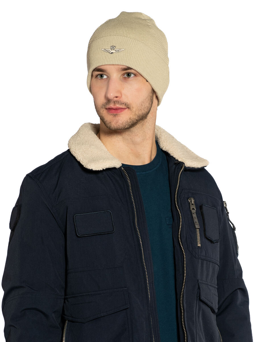 Шапка Aeronautica Militare CU0086. Полушерстяная шапка связана объемным узором в виде сот. Модель выполнена с ребристым отворотом, на котором вышит символ бренда - орел. Состав: 50% хлопок, 50% шерсть. Цвет Pellican: бежевый. Страна бренда: Италия. Страна производства: Китай.