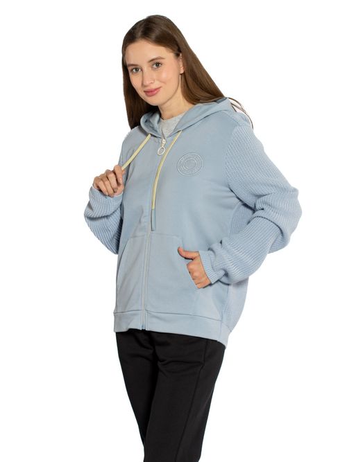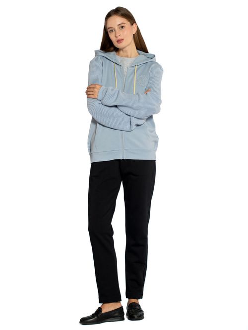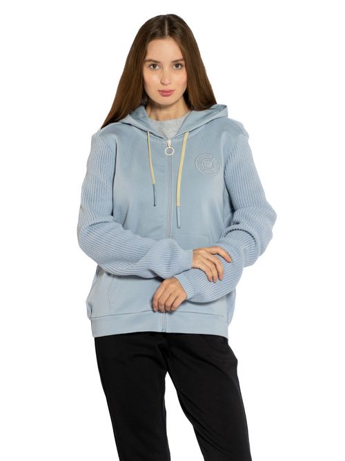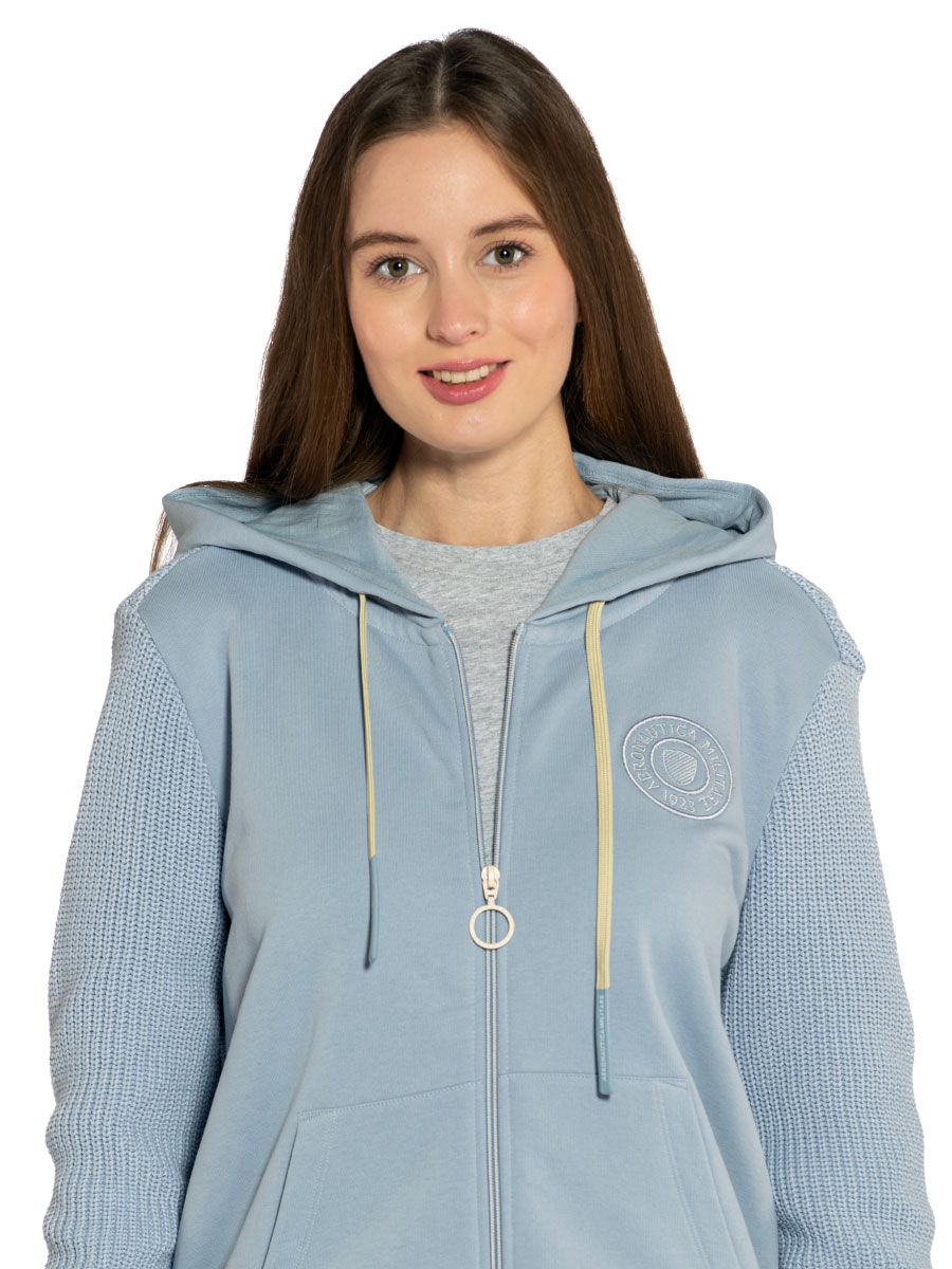 Толстовка женская Aeronautica Militare FE1980D. Комбинированная толстовка с капюшоном сочетает мягкий смесовой хлопок с трикотажными вставками из хлопка на спине и рукавах. Хлопок в составе обеспечивает хорошую воздухопроницаемость, а искусственные волокна быстро сохнут и предохраняют ткань от сминания. Мягкая внутренняя часть обеспечивает высокий комфорт и тепло во время активного отдыха. Толстовка застегивается на молнию с кольцом, имеет карманы-кенгуру. На груди тональная вышивка логотипа Аэронавтика Милитари. Универсальная толстовка от итальянского бренда. Состав: 85% хлопок, 15% полиэстер + 100% хлопок. Цвет Cielo: голубой. Страна бренда: Италия. Страна производства: Турция.