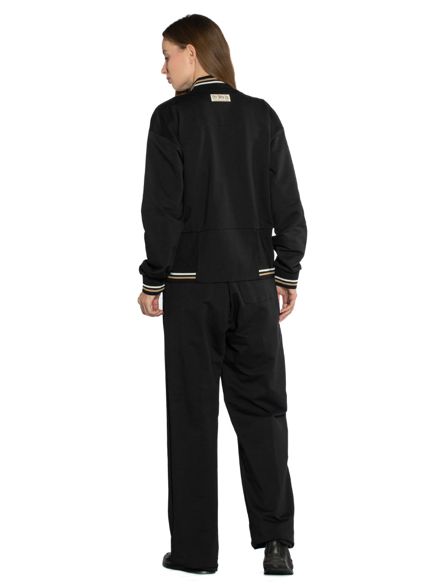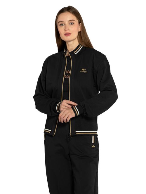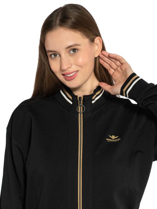 Толстовка женская Aeronautica Militare FE2018D. Толстовка в стиле спорт-шик отшита из дышащего хлопка-стрейч. Хорошую посадку по фигуре обеспечивает широкий эластичный пояс в рубчик. Воротник-стойка и рукава имеют ребристый дизайн. Толстовка украшена контрастной двухцветной полосатой отделкой. На груди гелевый принт логотипа бренда, на спине нашивка "Лети со мной". Модное сочетание спортивной функциональности и фирменного стиля итальянского бренда. Состав: 95% хлопок, 5% эластан. Цвет Nero: черный. Страна бренда: Италия. Страна производства: Турция.