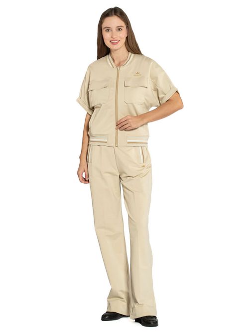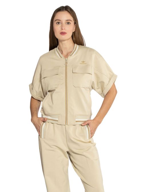 Толстовка женская Aeronautica Militare FE2000D. Эффектная толстовка в стиле бомбер с короткими рукавами выполнена из эластичного хлопкового трикотажа. На модели четыре кармана: накладные нагрудные с клапанами и прорезные боковые для рук. Хорошую посадку по фигуре обеспечивает широкий эластичный пояс в рубчик. Рифленый пояс и воротник и украшены контрастной двухцветной полосатой отделкой. На груди гелевый принт логотипа бренда, на спине нашивка "Лети со мной". Свитшот составит органичный дуэт с фирменными брюками. Состав: 95% хлопок, 5% эластан. Цвет Sabbia: песочный. Страна бренда: Италия. Страна производства: Турция.