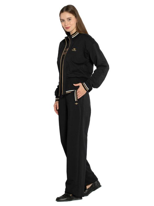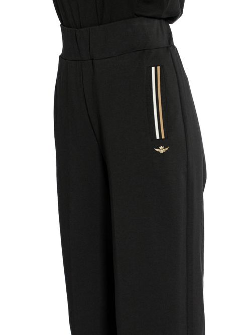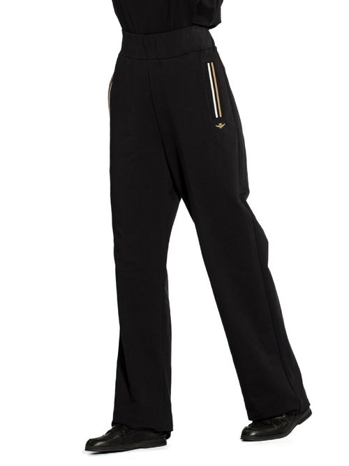 Брюки женские Aeronautica Militare PF974D. Брюки кроя палаццо выполнены из мягкого хлопка с легким стрейчевым эффектом. Брюки имеют комфортный эластичный пояс. Боковые карманы украшены контрастной двухцветной полосатой отделкой, задний накладной карман дополнен нашивкой "Лети со мной". Брюки составят органичный дуэт с фирменной толстовкой. Состав: 95% хлопок, 5% эластан. Цвет Nero: черный. Страна бренда: Италия. Страна производства: Турция.