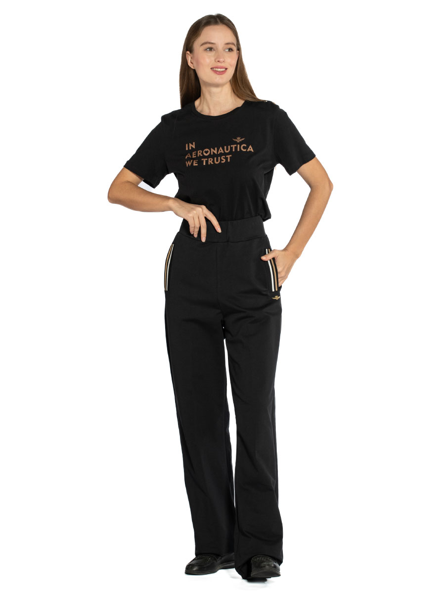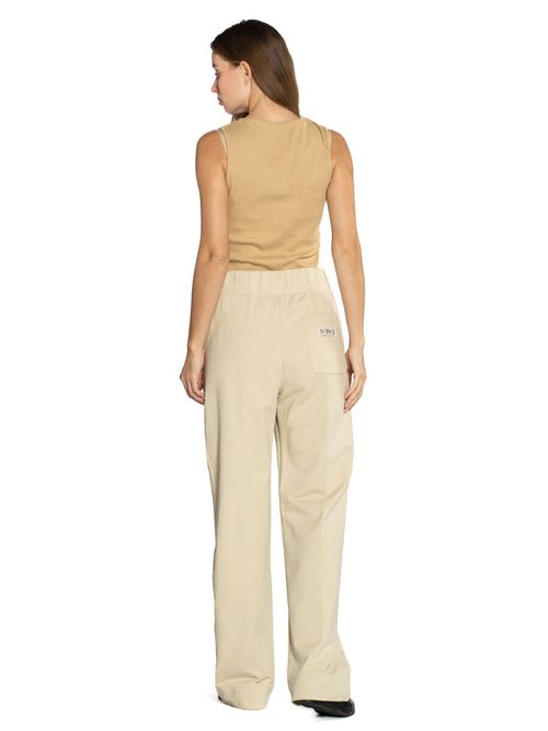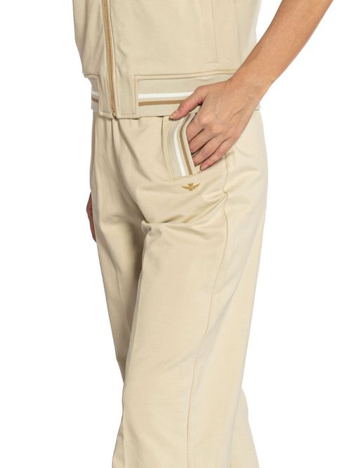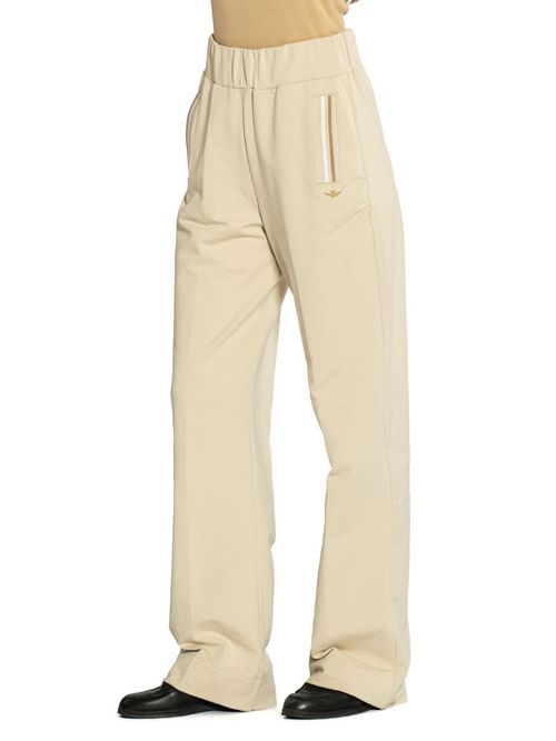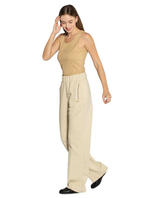 Брюки женские Aeronautica Militare PF974D. Брюки кроя палаццо выполнены из мягкого хлопка с легким стрейчевым эффектом. Брюки имеют комфортный эластичный пояс. Боковые карманы украшены контрастной двухцветной полосатой отделкой, задний накладной карман дополнен нашивкой "Лети со мной". Брюки составят органичный дуэт с фирменной толстовкой. Состав: 95% хлопок, 5% эластан. Цвет Sabbia: песочный. Страна бренда: Италия. Страна производства: Турция.