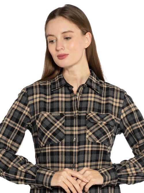 Рубашка женская Bask Lynx. Фланелевая рубашка - средний слой из коллекции «За Полярным Кругом». Модель выполнена из материала с эффектным принтом в клетку тартан. Мягкая хлопковая фланель, теплая и тактильно приятная, укреплена прочным полиэстером. Рубашка с фигурным нижним краем застегивается на пуговицы, манжеты - на кнопки. На груди два накладных кармана, левый с клапаном на кнопке. Длинные рукава можно подвернуть и зафиксировать при помощи хлястика. Рубашка слегка приталенного кроя дает комфорт с достаточной свободой движений. Состав: 75% хлопок, 25% полиэстер. Цвет: клетка серый/бежевый. Произведено в России.
