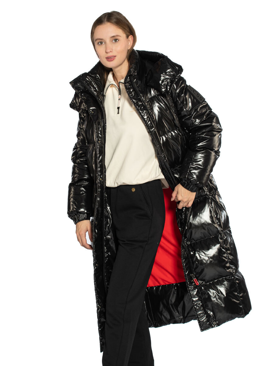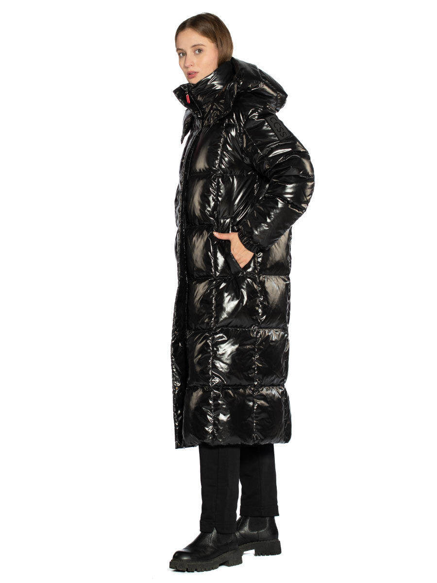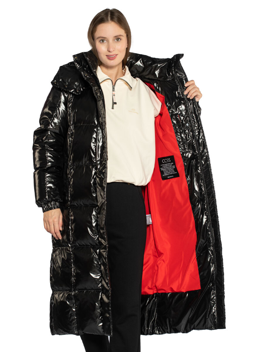 Пуховик женский Igor Plaxa DA90510. Эффектное пуховое пальто из линейки Accross, представляющей одежду в стиле спорт-шик. Пуховик прямого силуэта свободного кроя дополнен стежкой в форме квадратов. Центральная двухзамковая молния закрыта ветрозащитной планкой с кнопками. Предусмотрена защита подбородка от соприкосновения с замком молнии. Утепленный капюшон пристегивается на кнопки и регулируется по лицевому срезу утяжкой. Высокий воротник-стойка и дополнительная застежка на капюшоне надежно защищает нижнюю часть лица и шею в ветреную и морозную погоду. Большие теплые карманы на молнии закрыты планкой на кнопке. Внутри куртки два кармана на молнии. В манжеты рукавов вшита резинка, защищающая от задувания ветра. Завершает дизайн съемный патч на рукаве с айдентикой бренда. Пуховик выполнен из современного блестящего материала с водоотталкивающей пропиткой, имеет яркую пуходержащую подкладку и наполнен отборной пуховой смесью. Состав: 100% полиэстер. Подкладка: 100% полиэстер. Наполнитель: 90% пух, 10% перо. Цвет: черный. Страна производства: Россия.