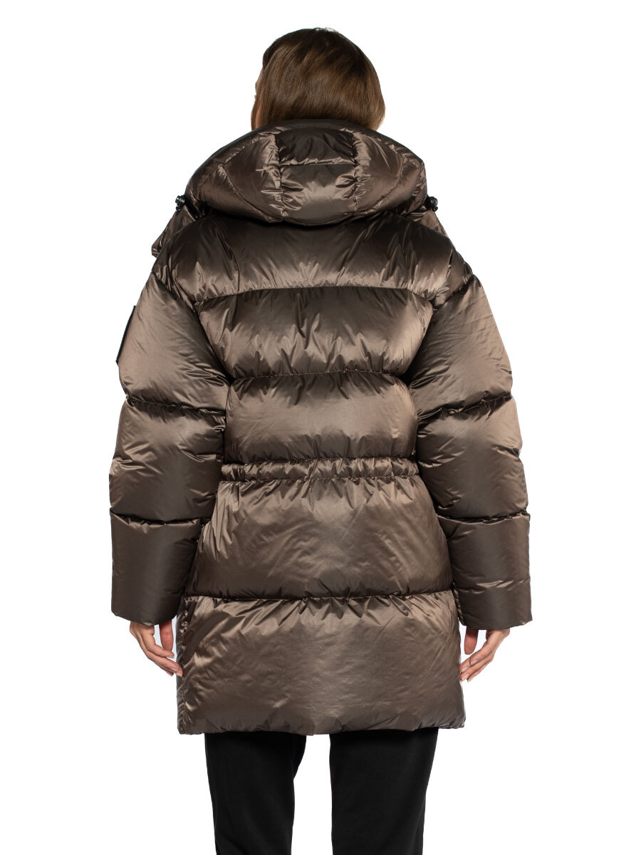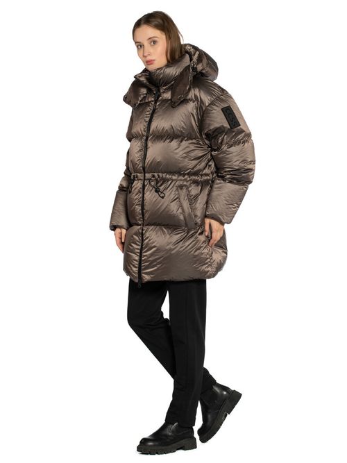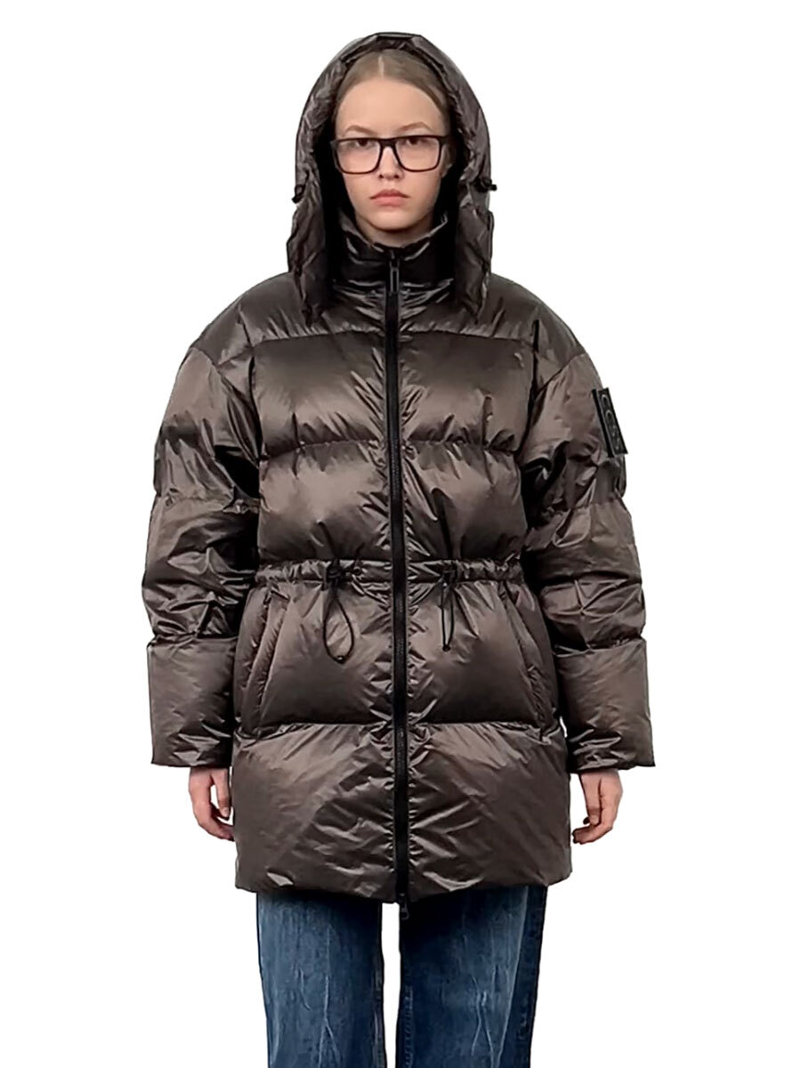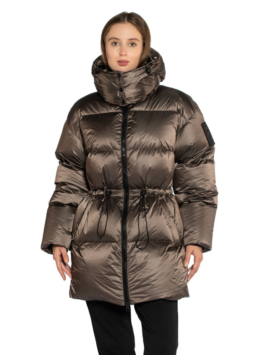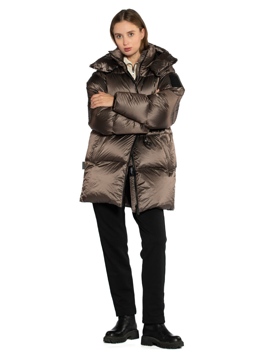 Пуховик женский Igor Plaxa DA91450. Свободный пуховик со спущенным плечом и акцентом на талию представляет линейку Accross функциональной одежды в городском стиле и стиле спорт-шик. Пуховая куртка отшита из высококачественного нейлона с водоотталкивающей пропиткой. Центральная двухзамковая молния дополнена внутренней ветрозащитной планкой. Утепленный капюшон пристегивается на кнопки и регулируется по лицевому срезу утяжкой. Высокий воротник-стойка и дополнительная застежка на капюшоне надежно защищают нижнюю часть лица и шею в ветреную и морозную погоду. Два теплых кармана на молнии закрыты планками. Внутри куртки два кармана на молнии. В рукавах трикотажные манжеты. Объем модели отрегулируется с помощью кулисок по талии и низу изделия. Завершает дизайн съемный брендированный патч на рукаве. Эффектный функциональный пуховик имеет пуходержащую подкладку и наполнен отборной пуховой смесью. Состав: 100% нейлон. Подкладка: 100% полиамид. Наполнитель: 90% пух, 10% перо. Цвет: коричневый. Страна производства: Россия.