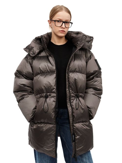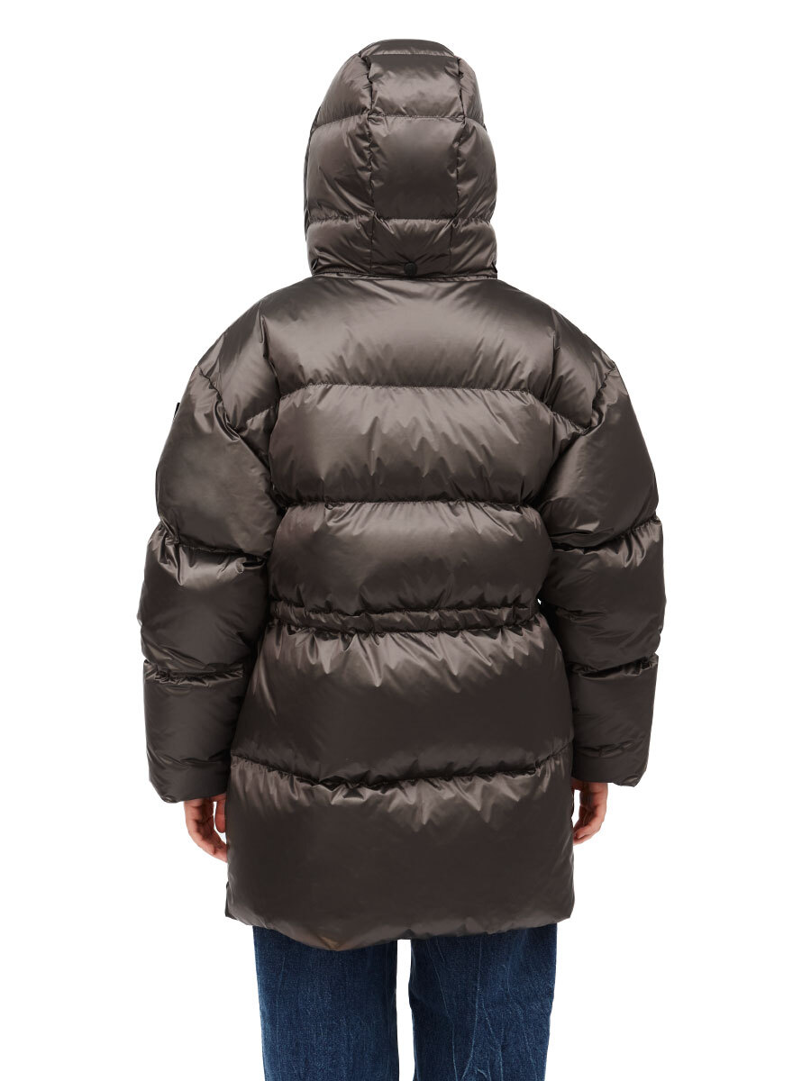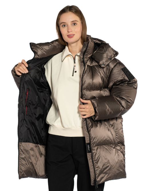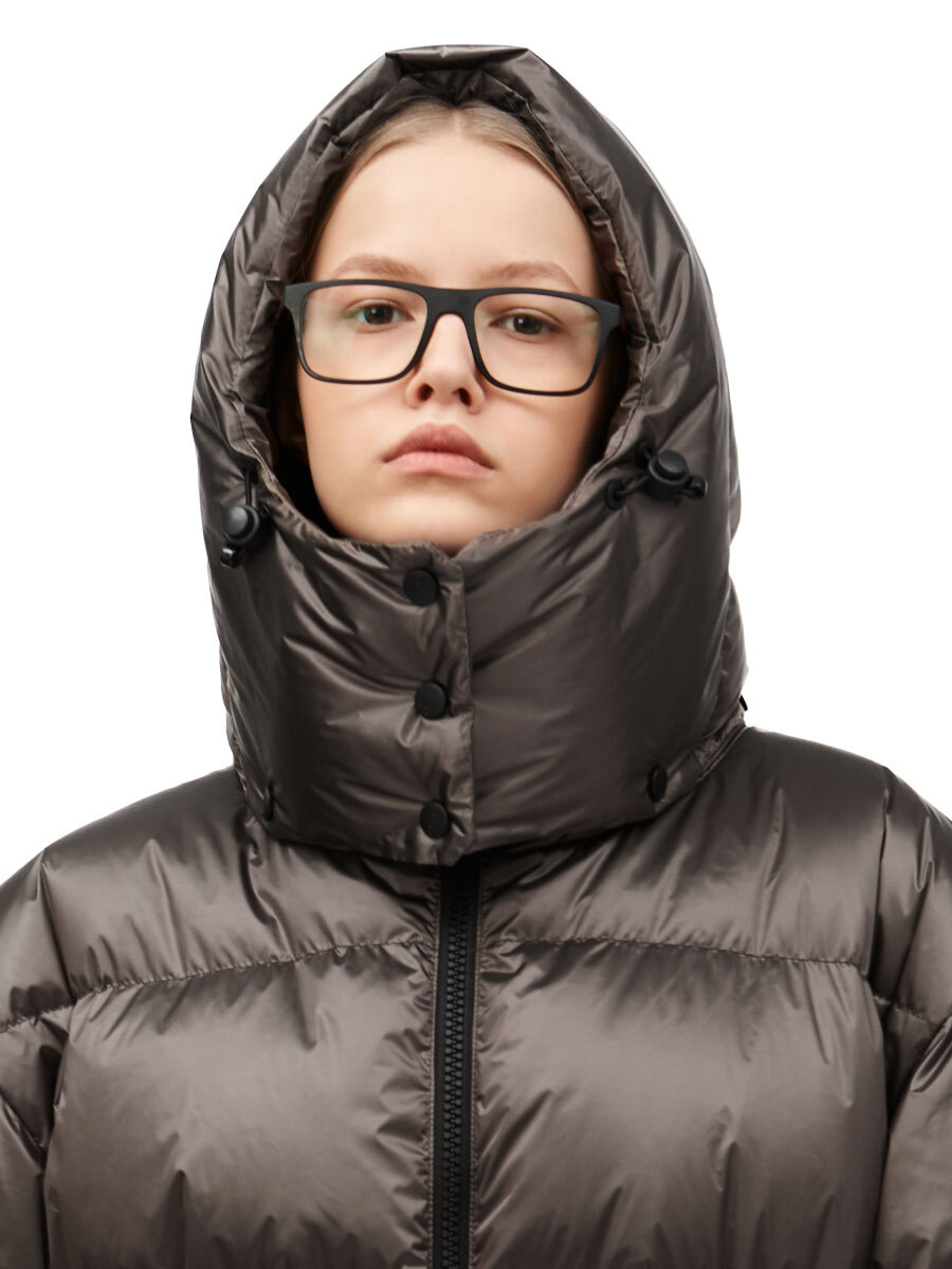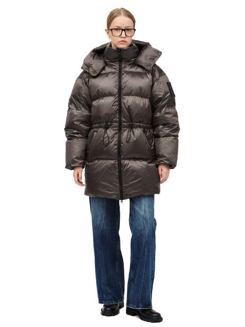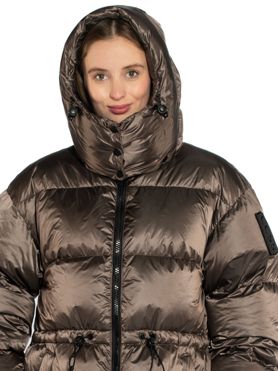Пуховик женский Igor Plaxa DA91450. Свободный пуховик со спущенным плечом и акцентом на талию представляет линейку Accross функциональной одежды в городском стиле и стиле спорт-шик. Пуховая куртка отшита из высококачественного нейлона с водоотталкивающей пропиткой. Центральная двухзамковая молния дополнена внутренней ветрозащитной планкой. Утепленный капюшон пристегивается на кнопки и регулируется по лицевому срезу утяжкой. Высокий воротник-стойка и дополнительная застежка на капюшоне надежно защищают нижнюю часть лица и шею в ветреную и морозную погоду. Два теплых кармана на молнии закрыты планками. Внутри куртки два кармана на молнии. В рукавах трикотажные манжеты. Объем модели отрегулируется с помощью кулисок по талии и низу изделия. Завершает дизайн съемный брендированный патч на рукаве. Эффектный функциональный пуховик имеет пуходержащую подкладку и наполнен отборной пуховой смесью. Состав: 100% нейлон. Подкладка: 100% полиамид. Наполнитель: 90% пух, 10% перо. Цвет: коричневый. Страна производства: Россия.