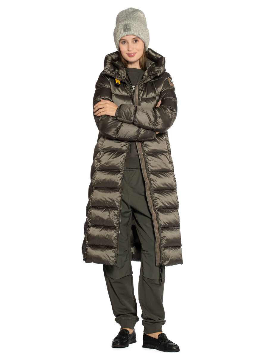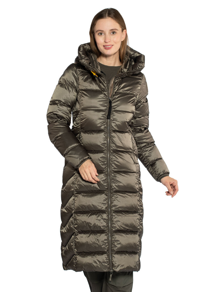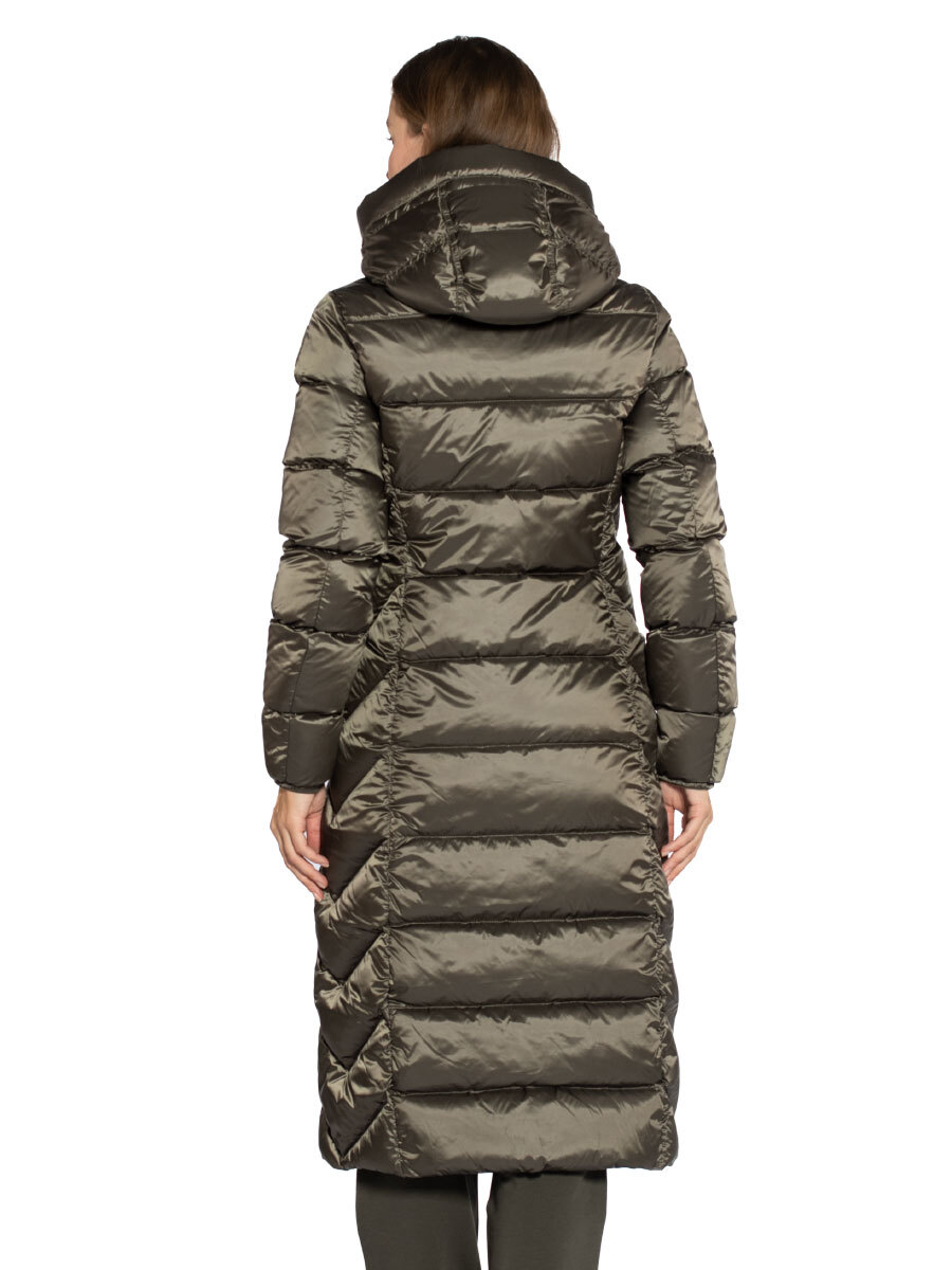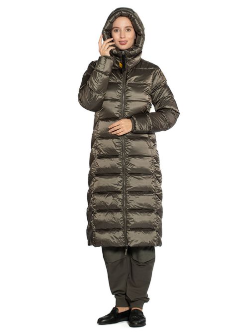 Пуховик женский Leah. Длинное пуховое пальто выполнено из прочного ветрозащитного материала с водоотталкивающей пропиткой. Верхняя ткань из волокон полиэстера и нейлона с плотным саржевым переплетением дополнена покрытием, не пропускающим пух. Изделие наполнено отборным утиным пухом. Пуховик полуприлегающего силуэта застегивается на двухзамковую молнию с внутренней ветрозащитной планкой. Спереди в вертикальных рельефных строчках скрыты два кармана на молнии. Высокий воротник-стойка дополнен внутренней трикотажной вставкой для комфорта при ношении. Несъемный капюшон регулируется эластичной утяжкой, рукава оформлены лайкрой по краю. Вентиляционные отверстия в области подмышек обеспечивают необходимый воздухообмен во время активного движения. Завершает дизайн брендированная нашивка на рукаве и фирменный желтый ремешок-застежка. Идеальный выбор на холодное межсезонье и теплую зиму. Состав: 60% полиэстер, 40% полиамид. Подкладка: 100% полиамид. Наполнитель: 100% пух. Цвет Olive Grey: серо-оливковый. Страна бренда: Италия. Страна производства: Индонезия.