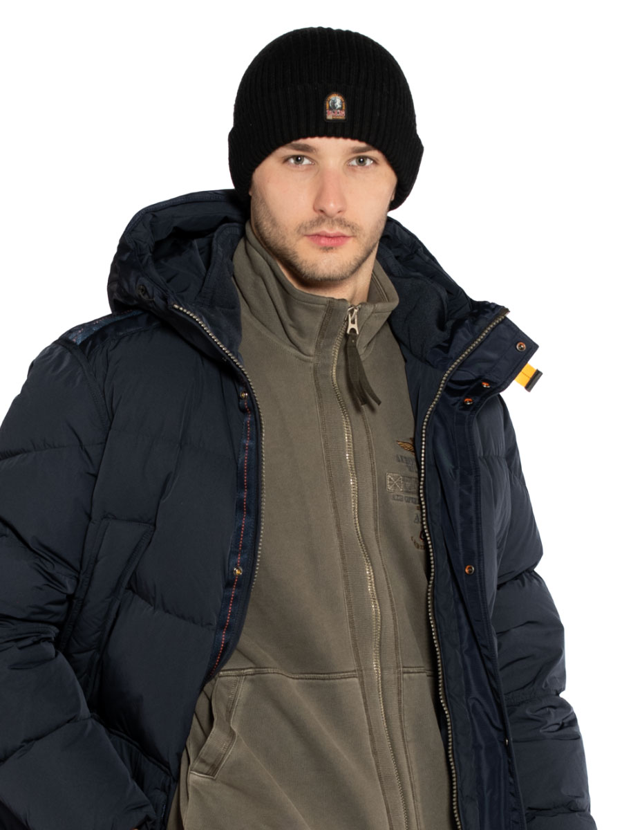 Шапка Parajumpers Rib Hat. Теплая шапка с отворотом, связанная рельефной резинкой. На отвороте нашивка с фирменным логотипом. Материал с мериносовой шерстью и синтетическими волокнами комфортный и долговечный, хорошо согревает голову, лоб и уши, обеспечивает износостойкость, комфорт и хорошую посадку на голове. Состав: 70% мериносовая шерсть, 30% акрил. Цвет Black: черный. Страна бренда: Италия. Страна производства: Китай.