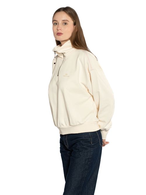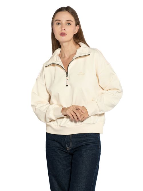 Толстовка женская Parajumpers Zendaya. Универсальная толстовка оверсайз со спущенным плечом и высоким воротником на молнии 1/3. Мягкий легкий смесовой хлопок с гладкой лицевой стороной имеет фактурную приятную к телу изнанку в диагональный рубчик. Манжеты и низ изделия выполнены с ребристым дизайном. На плечах вставки с оранжевой отстрочкой, на груди брендированный принт. Комфортный выбор в прохладную погоду. Состав: 85% хлопок, 15% полиэстер. Цвет Moonbeam: кремовый. Страна бренда: Италия. Страна производства: Молдова.