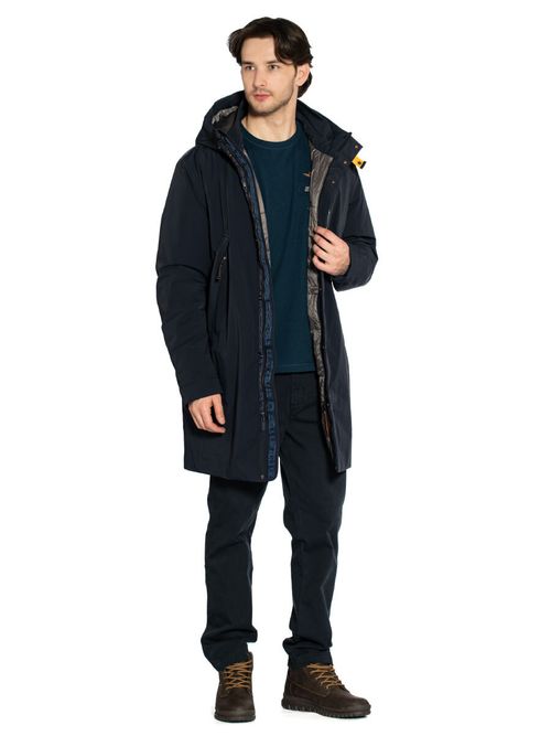 Парка мужская Easy. Длинная утепленная куртка с проклеенными швами. Внешний материал - технологичная трехслойный эластичный полиэстер-нейлоновый поплин с водоотталкивающей пропиткой. Парка стандартной посадки застегивается на двухзамковую молнию, закрытую ветрозащитной планкой с потайными кнопками. Воротник-стойка дополнен несъемным регулируемым капюшоном. На пуховике три кармана на молнии: два боковых с клапанами и один нагрудный. Внутри изделия карман на липучке. Манжеты рукавов регулируются фиксатором на кнопке. Объем парки регулируется внутренней кулиской на талии. Завершает дизайн силиконовая нашивка на рукаве и фирменный желтый ремешок-застежка. Хороший выбор на межсезонье в городском стиле. Состав: 58% полиамид, 33% полиэстер, 9% эластан. Подкладка: 100% полиамид. Наполнитель: 100% полиэстер. Цвет Blue Navy: темно-синий. Страна бренда: Италия. Страна производства: Китай.